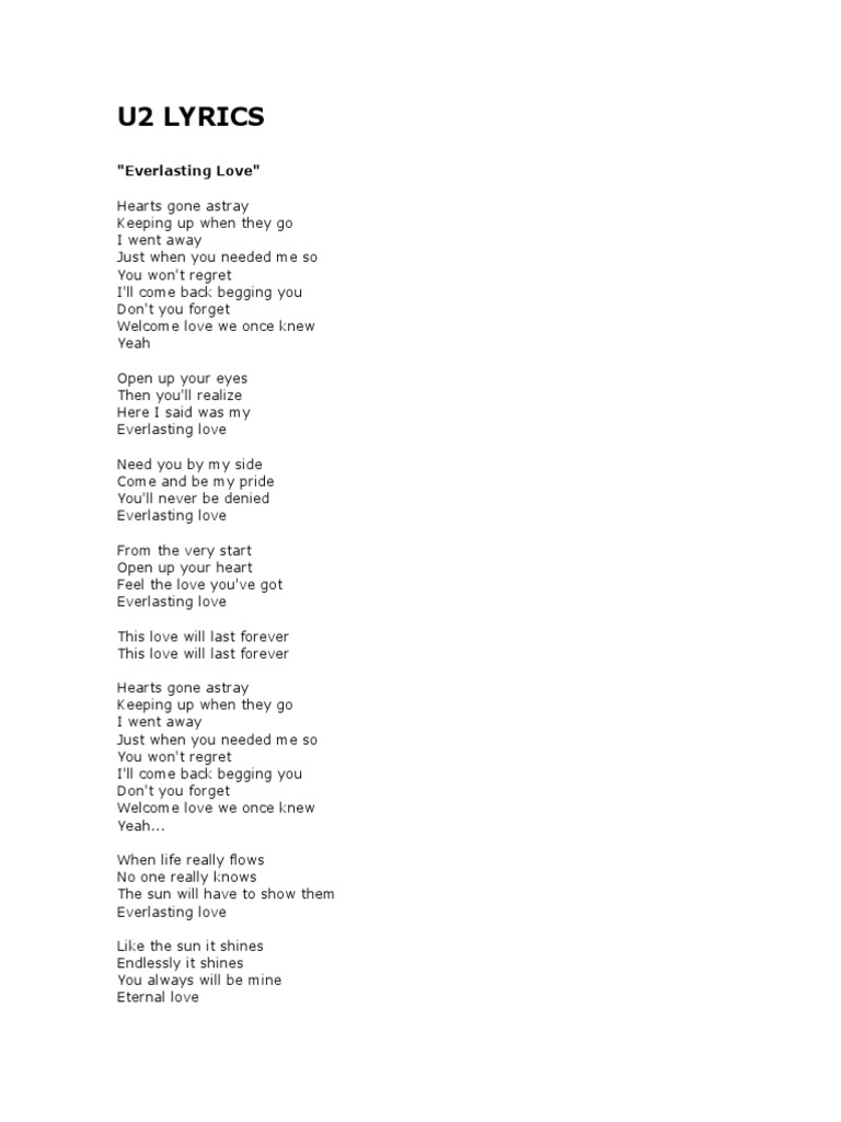 Everlasting Love Lyrics U2 - Hearts gone astray keeping up when they go i went away just when you needed me so you won't when life really flows no one really knows the sun will have to show them everlasting love.