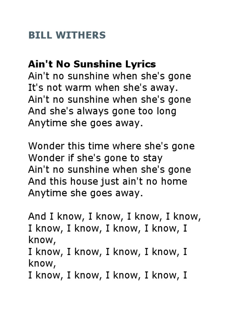 Lyrics Ain't No Sunshine Bill Withers / Album bill withers live at carnegie hall (1973). Lyrics Ain't No Sunshine Bill Withers - Comment and share your favourite lyrics.